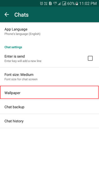 It is always a good practice to create a healthy environment before talking to other people on WhatsApp. This IM allows users to choose wallpaper or solid color in the chat background that would let you make a healthy space for you. The most interesting thing is you can select any wallpaper as the background. Go to Settings > Chats > Wallpaper. Now, select a source and choose a wallpaper or solid color.