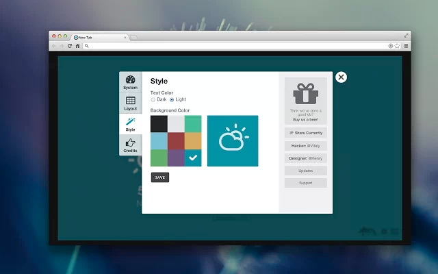 Ever desired that your chrome browser display something nice other that the list of the frequently visited sites? Currently is an extension that replaces the default new tab page with a beautifully designed page that shows the time and the weather at your place. You can customise this page to have the different coloured backgrounds, show weather for specific location and more. And whenever you do want to see the list of frequent sites or the chrome web apps, you can click the icon on the bottom right.
