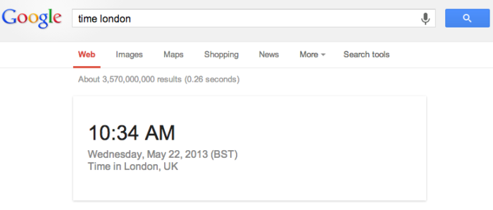 Countless time you would want to know the current time at a place in the World like New York, London etc. Google can get that for you with a simple “Time London” query, replace London with any city or country you wish to know time of.