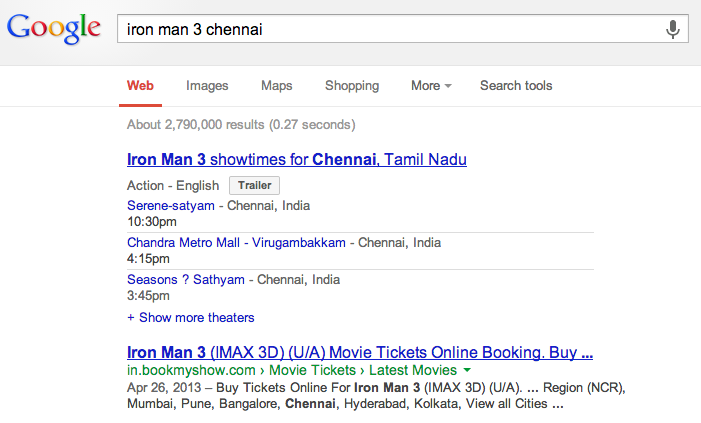 Get Movie Timings in your city, simply type the movie name and the city where you live. Sometimes just the movie name alone would be enough.