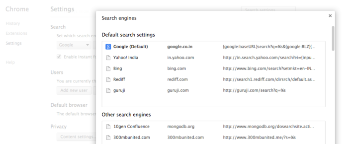 What’s more, you can also change the default search engine to any other search providers other than Google! To do this, head to the settings page and under search you would find a selection box with Google on it. You can add more search engines by clicking “Manage search engines” option.