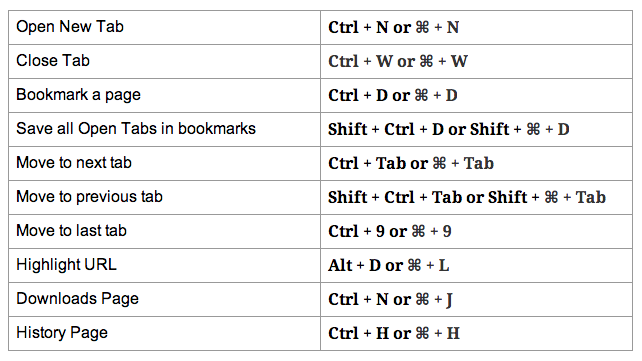 Chrome has some awesome list of shortcuts for use. Besides the basic shortcuts such as to open a new tab (Ctrl + N / ⌘ + N), bookmark a site (Ctrl + D / ⌘ + D), one can close the tabs (Ctrl + W / ⌘ + W), reopen last open tab (Shift + Ctrl + T / Shift + ⌘ + T) and more. The table below has the list of some cool keyboard shortcuts you can use on Chrome.