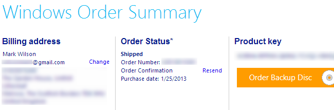 Head to the Windows Order Summary Page and the fill the form. If you are not sure where you can find the order number, folks at How To Geek suggest that you shall find it your inbox (Search for “Thanks for Ordering Windows 8” as the subject title if you are in Gmail).