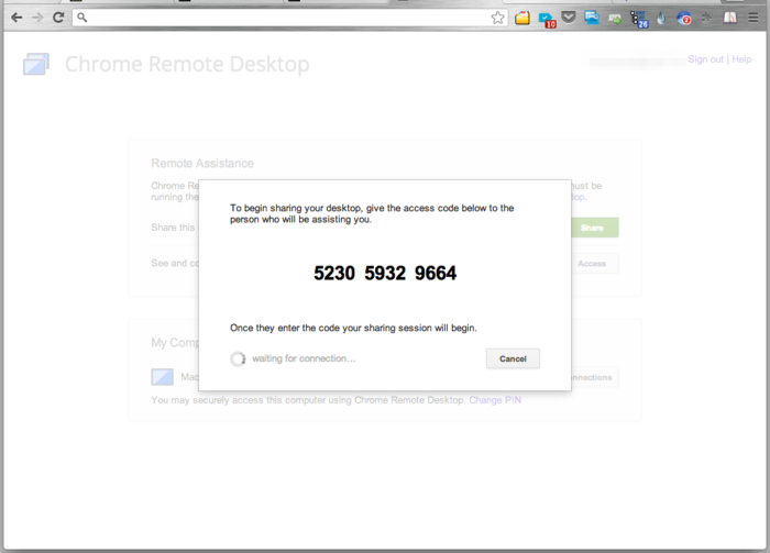 The way this works is that the person who wants to share his computer, passes a 12 digit code to the other person that is generated by the Chrome Remote Desktop app. The other person enters this 12 digit code into the same app in their chrome browser. The connection is established over a secure channel once this code is authenticated. The person can then work on the shared computer right in the chrome browser!