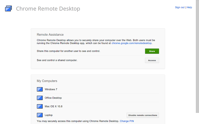The extension also lets you connect to your computer from any computer that has a chrome browser in it through the Remote Desktop option. Your computer needs to be set up for the remote desktop connection, generally found under system settings (On Windows, it’s found in accessories; In Mac OS X, it’s under Sharing Settings). You can set up multiple remote desktop connections, useful when you are away and want to access your computer.