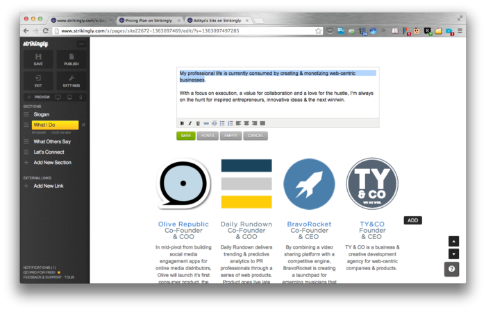 Once a template is selected, Strikingly leads to you to the edit section. Here you see the actual website in action, that is how it would look on your browser. You can edit every part of the website, like the background, the text boxes, and more. Although you have a great selection you can choose to add in your site, the level of customization is limited. But the number of templates on offer and the good number of features you can add or edit is good enough for most people. You can set up multiple pages to your sites and add features, such as normal text boxes, image boxes, connect options through Facebook, Twitter, etc. Editing your webpage on Strikingly is a breeze.