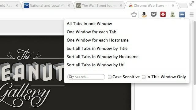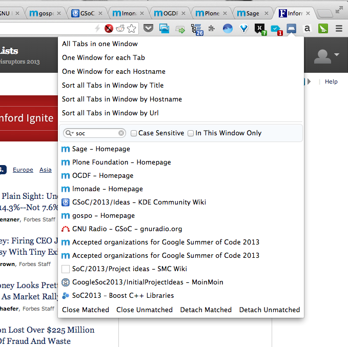 One of the killer features is the ability to add filters to manage tabs. You can choose to group tabs based on the hostname, sort the tabs based on the hostname, title, or url. Tab Juggler lets you select tabs based on a filter of your choice through the search box. You can even check for case, search only in the current window. As you type, a list of tabs that match the filter show up. You can then choose to open these tabs in a new window or close them.