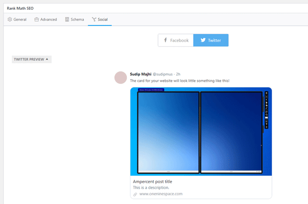 At first, finish writing your post and upload images as well. After that, you should navigate to the “Rank Match SEO” section. Here you can see a tab called “Social.” After clicking this tab, switch to the Twitter option. Following that, you need to choose the type of card – Summary Card or Summary Card with Large Image. Based on the selection, you need to choose an image and enter some basic details so that the tweet looks better.